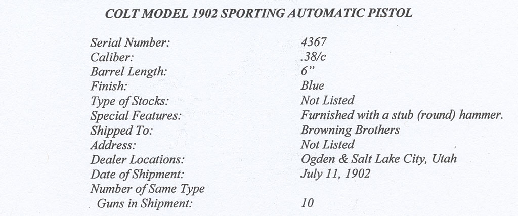 blue finish, furnished with a stub (round) hammer. This Colt 1902 Sporting Model was in the first batch of