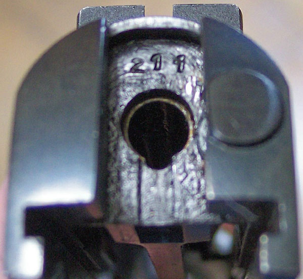 Close-up of right side slide markings and serial number.