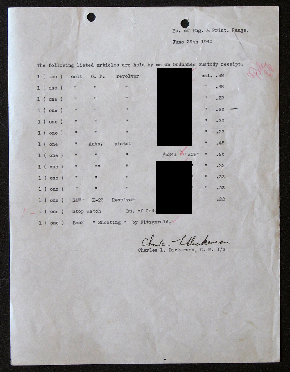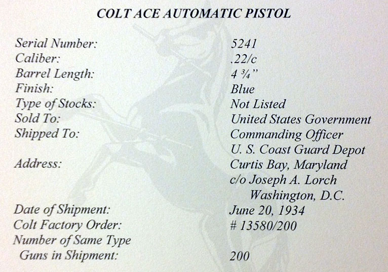 National Archives Records for Colt Ace serial number 5241.