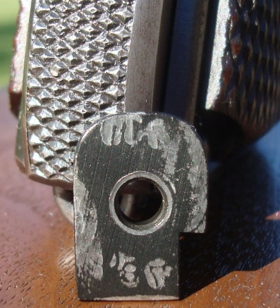 on the right side of the slide, as on the 1924 Transition Models. Slide has a matching serial number. Left side slide marking. Colt "VP" Verified Proof mark on