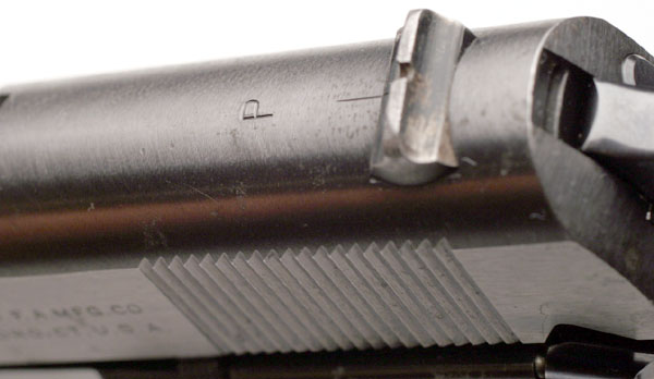 Barrel also marked "COLT 45 AUTO" on left side and "P" on left lug.