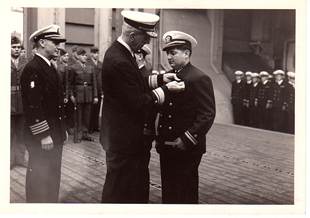 Flying Cross citation presented to Ensign Melvin C. Roach,