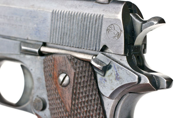 Left side close-up. Colt logo in a circle on the left side of the slide behind
