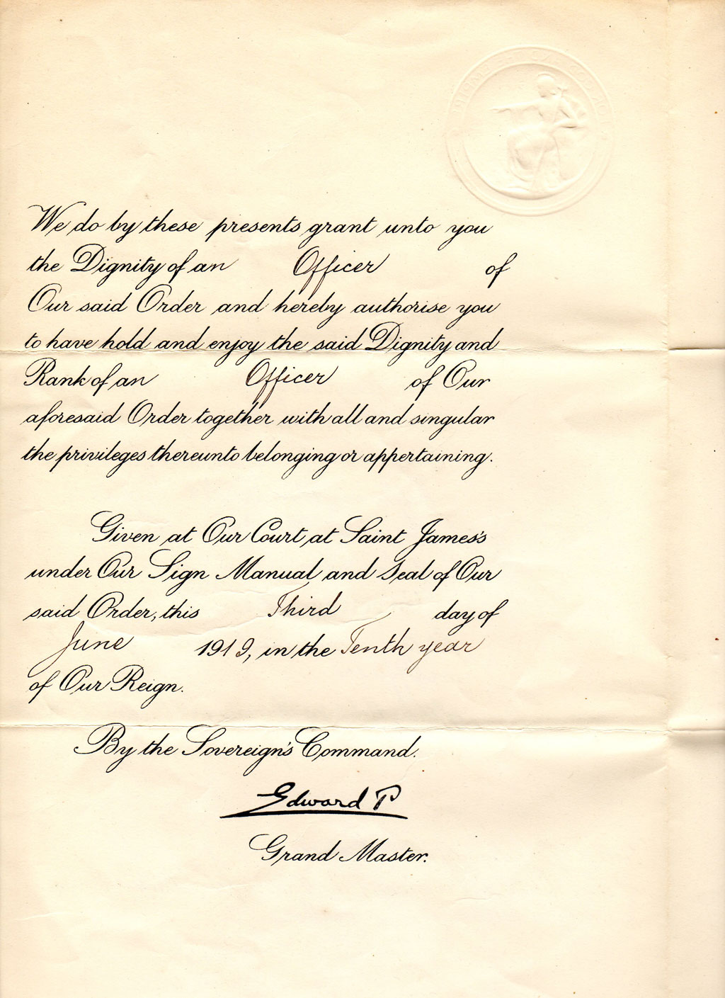 Order of the British Empire medal in June, 1919.