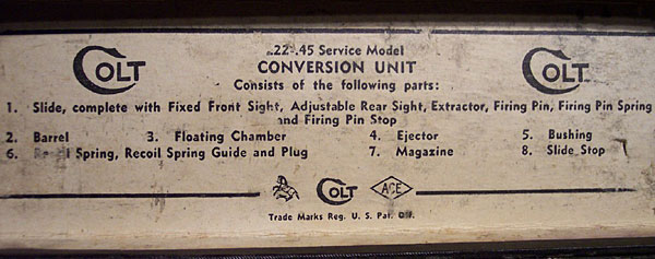 Listing of eight component parts (as opposed to seven in post-war box) for the pre-war .22 Service Model Conversion Unit printed inside box lid.