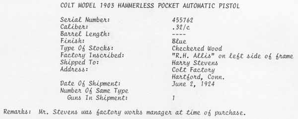 Aside from the factory inscription, another feature that makes this pistol extremely unique is the presence of forward facing flush nickel silver grip medallions.  When viewing either side of the pistol, the horse on the grip medallion faces the front of the pistol.  The earliest pistols produced with these grips had the "WOOD BLUE" label on the upper end flap of the box.  These labels were used for a very short period of time until the checkered walnut grips became the standard grips for this model.  The pistol was shipped to Harry Stevens (of Stevens Sight fame) at Colt Patent Fire Arms Mfg. Co in 1924.  Mr. Stevens was Factory Works Manager at the time of shipment.