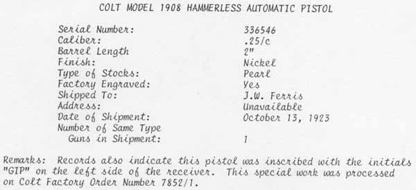 Model N .25 Factory Engraved & Factory Inscribed "Gip" on the left side of the frame. Factory engraved and inscribed examples are seldom encountered. Gun was shipped to J.W. Ferris on October 13, 1923 as Special Order one gun shipment.