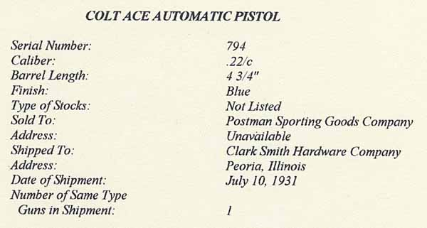 Colt Ace serial number 794 - Pistol was shipped July 10, 1931 as a single gun shipment. Sold to Postman Sporting Goods Company, Shipped to Clark Smith Hardware Company, Peoria, Illinois. Pictured with its original box, test target numbered to the gun, instructions, special instructions and cleaning brush. The Ace model was a limited production pistol with just under 11,000 guns produced. This Ace and its original box are in excellent condition.