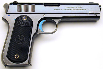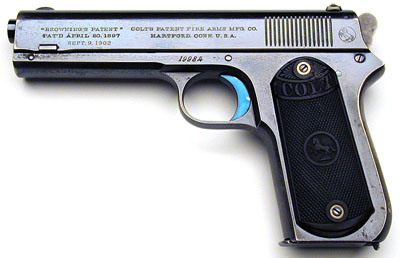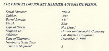 October's Gun of the Month is a Model 1903 Pocket Hammer serial number 19984 (circa. 1903) Pistol features early high polish finish, round case hardened hammer and fire blued trigger, pins and screws. In 1903, Colt's began producing this model in descending serial number order starting with serial number 19999. This pistol is the 15th gun produced. Only the very earliest examples have the plunge milled slide serrations. Shipped to Harper and Reynolds, Co., Los Angeles, CA, December 7, 1903, 2 guns in shipment. This was the first day of commercial shipments.