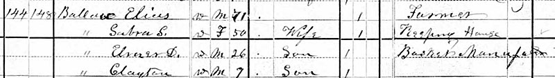 1880 Census entry for the Ballou Family - Elmer D, Ballou (third line form the top) is age 26 at the time and is listed as a Basket Manufacturer.
