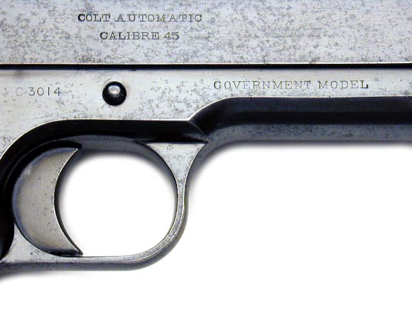 Colt Government Model serial number C3014 with factory monogrammed ivory stocks - Right side showing serial number and GOVERNMENT MODEL mark on the forward part of the frame.  "K" on upper right flat of the trigger guard indicates that this pistol was returned to Colt at some point, possibly for the later finish it now contains.