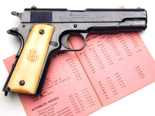 In 1916, the price of the Government Model was $22.00 and factory ivory stocks were available for an additional $5.00.  The fact that the price of special order stocks was roughly equivalent to 25% of the cost of the pistol, resulted in few sets of these stocks being ordered as an option.