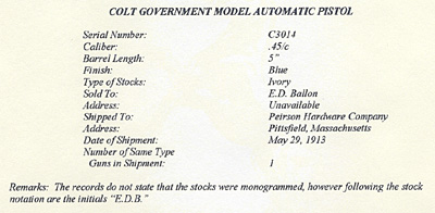 Early Colt Government Model Serial Number C3014  - A single gun shipment shipped May 29, 1913 to Peirson Hardware, Pittsfield, MA, this pistol is fitted with a beautiful set of monogrammed ivory stocks that letter to the gun.