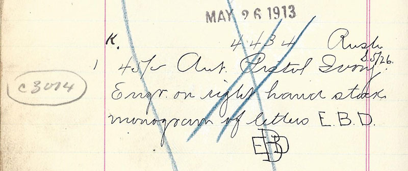 Colt Government Model serial number C3014 with factory monogrammed ivory stocks - Original entry from the Colt Special Ledgers which were used to record all factory special order Colts and embellishments.  Note how the entry includes the actual drawing of the monogram on the right stock.