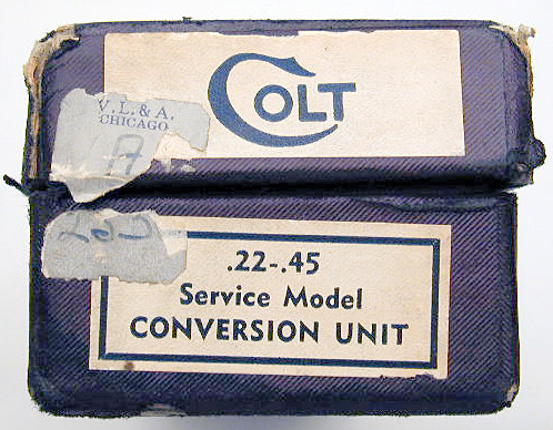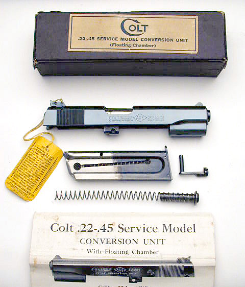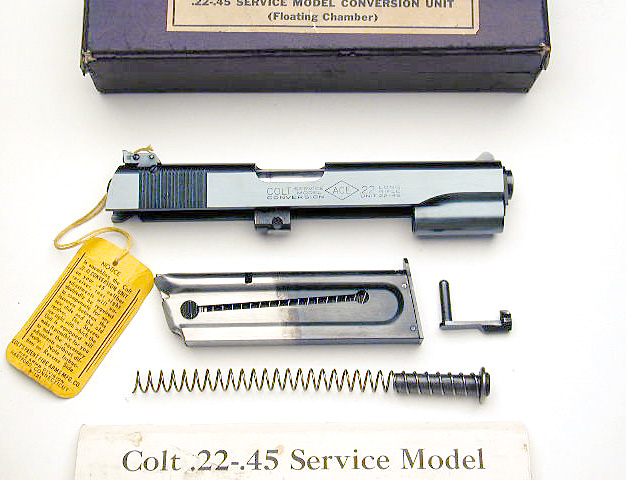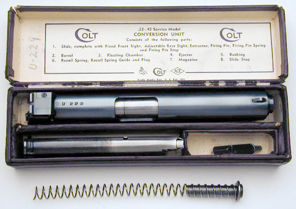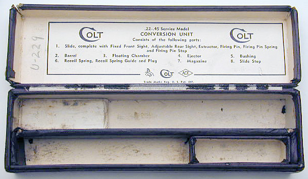 Early Pre-WWII (ca. 1938) Numbered .22-.45 Conversion Unit U229 - complete with original box, instructions and all accessories. Two tone magazine with "Service Model" designation on the floorplate. Box is earliest type that lacks center compartment for recoil spring.