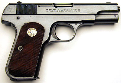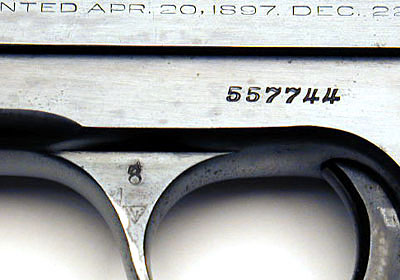 Copy of Colt Factory Letter. ![]() 1903 Colt .32 ACP serial number 557744 - close-up of flaming bomb ordnance mark. ![]() Right side of Colt Model M .32 ACP serial number 557744. Note the lack of the "U.S. PROPERTY" marking on the right side of the frame. |
