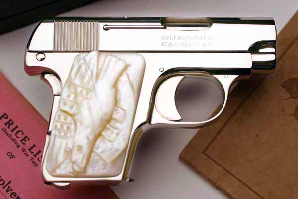 Colt Model 1908 Vest Pocket sn 364025 Factory Nickel Plated with Carved Eagle Mother of Pearl grips - Pistol is cased in Colt factory presentation case and features a relief carved eagle on the right grip. The left grip is a standard mother of pearl grip with medallion. Factory carved mother of pearl grips are an extremely scarce variation to locate for this particular model of Colt pistol. In 1921, these grips were a $9.00 option on a gun that retailed for $16.50, bringing the total cost to $25.50.