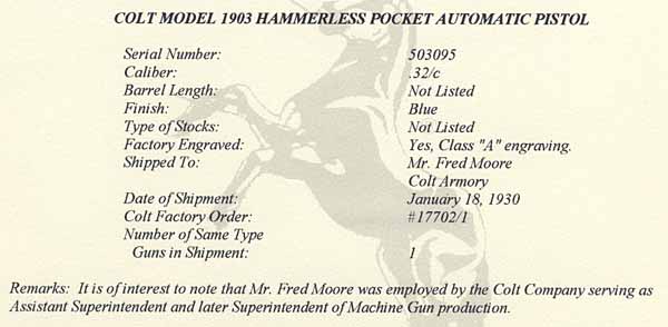 Colt 1903 .32 serial number 503095 – Factory engraved "A", blued finish, mother of pearl grips. Shipped January 18, 1930. Pistol was owned by Mr. Mauro Falletta who obtained it in 1930. Mauro Falletta emigrated from Sicily in the 1890s and began work in the Cadillac plant as an upholstery installer. He became interested in real estate and eventually owned a real estate company and an oil company that delivered home heating oil. During WWII, he served as the local air raid marshal. He Lived to the age of 101. The factory letter confirms the engraving as Class "A" but does not list the mother of pearl grips. This pistol was shipped on January 18, 1930 to Mr. Fred Moore at the Colt Armory in a single gun shipment and was processed on Colt Factory Order Number 17702/1. The letter includes a remark: "It is of interest to note that Mr. Fred Moore was employed by the Colt Company serving as Assistant Superintendent and later Superintendent of Machine Gun production."