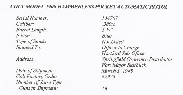 Colt 1908 Pocket Hammerless .380 ACP serial number 134767 G.H.D. Inspected - Colt Factory Letter confirms that this gun was one of 18 shipped on March 1, 1943 to "officer in charge, Hartford sub-office, Springfield Ordnance District for Major Starbuck." It was processed on Colt Factory Order # 2973.