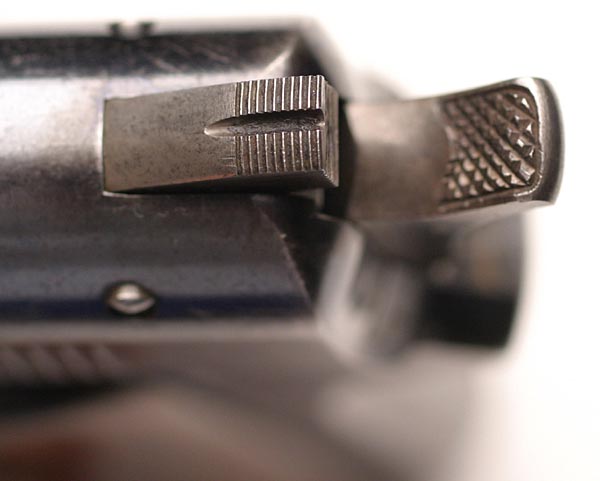 Sight Safety - locked in upward position, this functions as the rear sight. The sight safety and hammer were color case hardened.