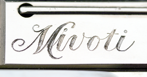 Factory inscription "Mivoti" on right side of the slide behind the Colt roll marks. |