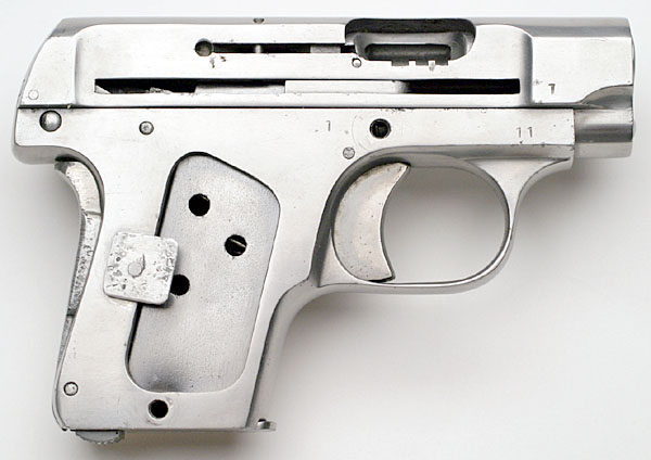 Slide and Frame are each numbered "1" with number "11" stamped above the trigger guard on the right side. It is suspected that the "1" were used to match to the slide and frame and the number "11" is for the location of the gun on the board. There are two threaded screw holes in the right side of the frame (at the opening of the magazine well and above the trigger) that were used to attach the gun to a Colt Factory Exhibit Board.