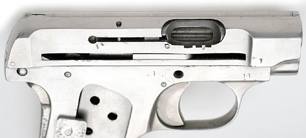 In examining a Colt factory display board, it is noted that the arms were all cut away on the back to fit flush against the fabric backing. Barrels were further cut away to avoid potential problems with crossing borders. Factory ledgers occasionally state that these cut away pistols are "condemned" meaning that they were rendered inoperable.