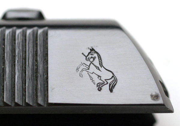 Close-up of Rampant Colt on left rear of slide, behing the serrations.