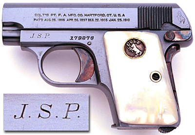 Factory inscribed Colt Vest Pocket Model 1908 .25 ACP serial number 179276, blued finish with Type III mother-of-pearl grips. The initials J.S.P. are inscribed in front of the serial number on the frame. Shipped to Mr. Morgan Stedman, Colt’s Patent Fire Arms Mfg. Co., Hartford, CT, March 19, 1918 as a one gun shipment. This work was processed on Colt Factory Order Number 887.