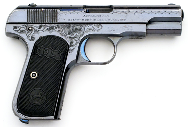Factory "A" Engraved Colt Model M .32 ACP - serial number 90175. Pistol was shipped blued, factory engraved with hard rubber grips. An unusual example as it contains all early Type III features even though it's in the Type II serial number range (approx. 72,000 - 105,000). Pistols in this range typically have a 3 3/4" barrel with separate barrel bushing. This pistol was one of 72 shipped October 22, 1912 to Norvell Shapleigh Hardware Company, St. Louis, Missouri.
