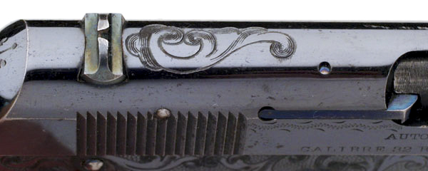 Engraving in front of rear sight, on top of slide.