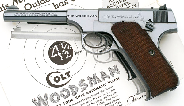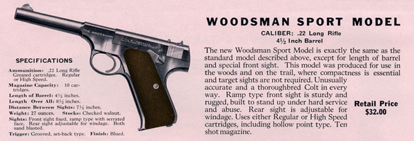 Colt Woodsman Sport .22 LR serial number 118653 - Left side view with original Colt factory advertisement announcing the New woodsman Sport with 4 1/2" barrel. |