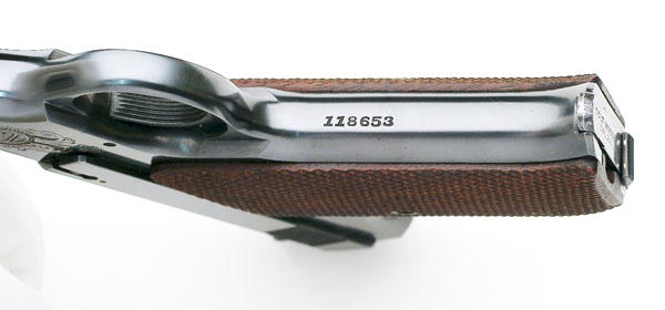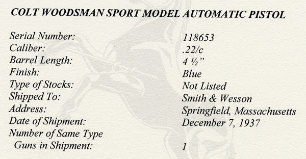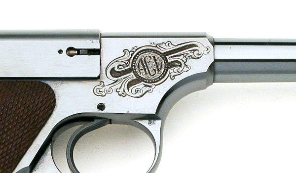 Colt Woodsman Sport .22 LR serial number 118653 - Inscribed "ALC" on the right side of the frame. The elaborate inscription is aftermarket and the gun was shipped December 7, 1937 to Smith & Wesson, Springfield, Massachusetts as a one gun shipment.