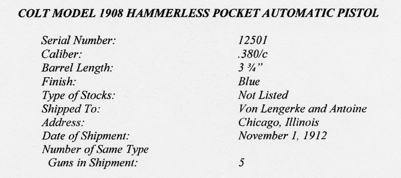 ![]() Colt Model 1908 .380 ACP serial number 12501 - fitted with early style factory recessed medallion deluxe checkered walnut grips. These grips are believe to pre-date the later recessed medallion deluxe checkered walnut grips with scalloped uncheckered border. This pistol was shipped on November 1, 1912 in a five gun shipment to Von Lengerke & Antoine, Chicago, IL. Finish is listed as blue, stocks not listed.
