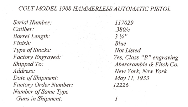 Colt 1908 Pocket Hammerless .380 ACP serial number 117029 - A very unique example with an unusual engraving pattern. This work is believed to have been done by Colt factory master engraver Wilbur Glahn. This pistol has factory "B" coverage, but what makes it most unusual is the engraving treatment on seven areas of the finish. In these areas, the engraving is cut through the blue in order to give the gun the appearance of having engraved silver or platinum inlays. This pistol is also fitted with beautiful period plain ivory grips. The factory letter describes this pistol as having a blue finish, stocks not listed, factory engraved and shipped to Abercrombie & Fitch, May 11, 1933, New York, NY as a single gun shipment on Colt factory order number 12226. (see letter below):