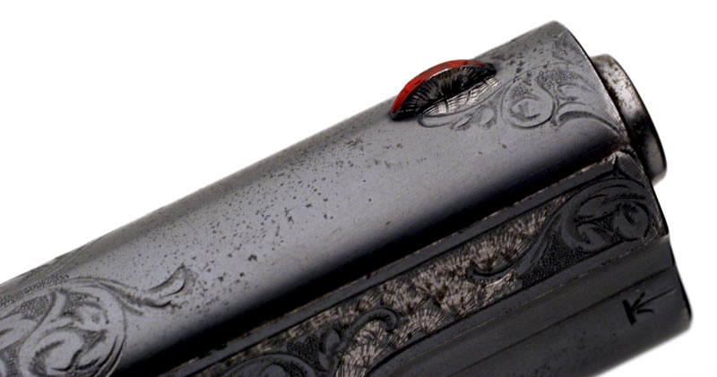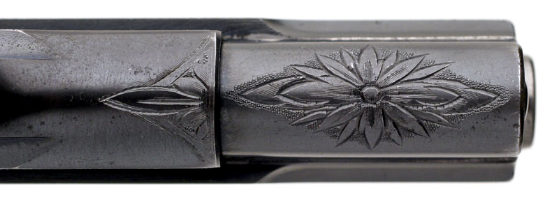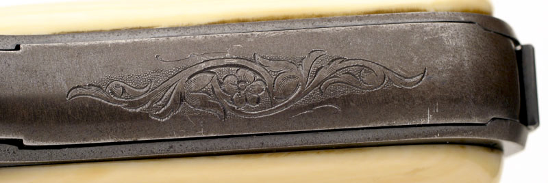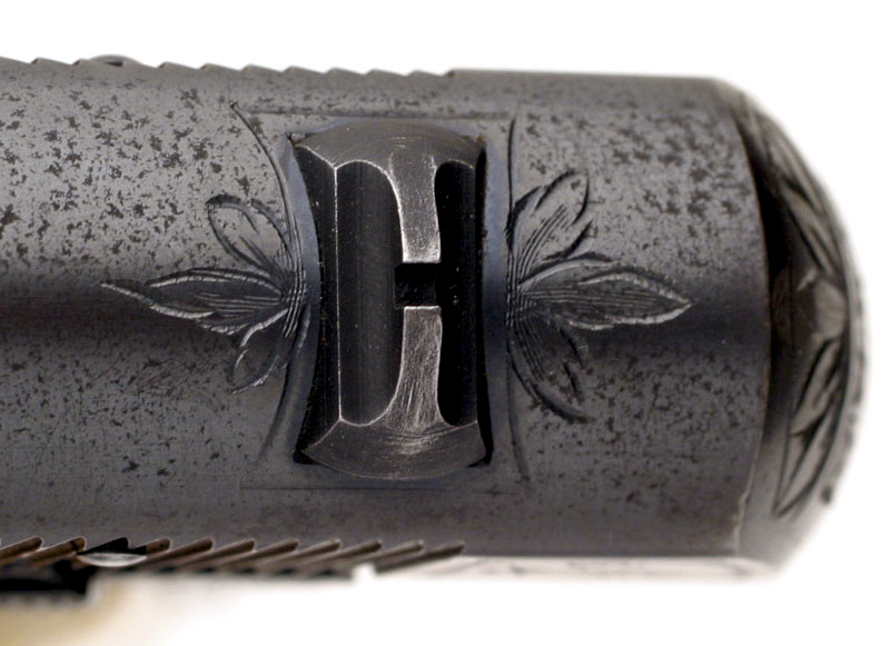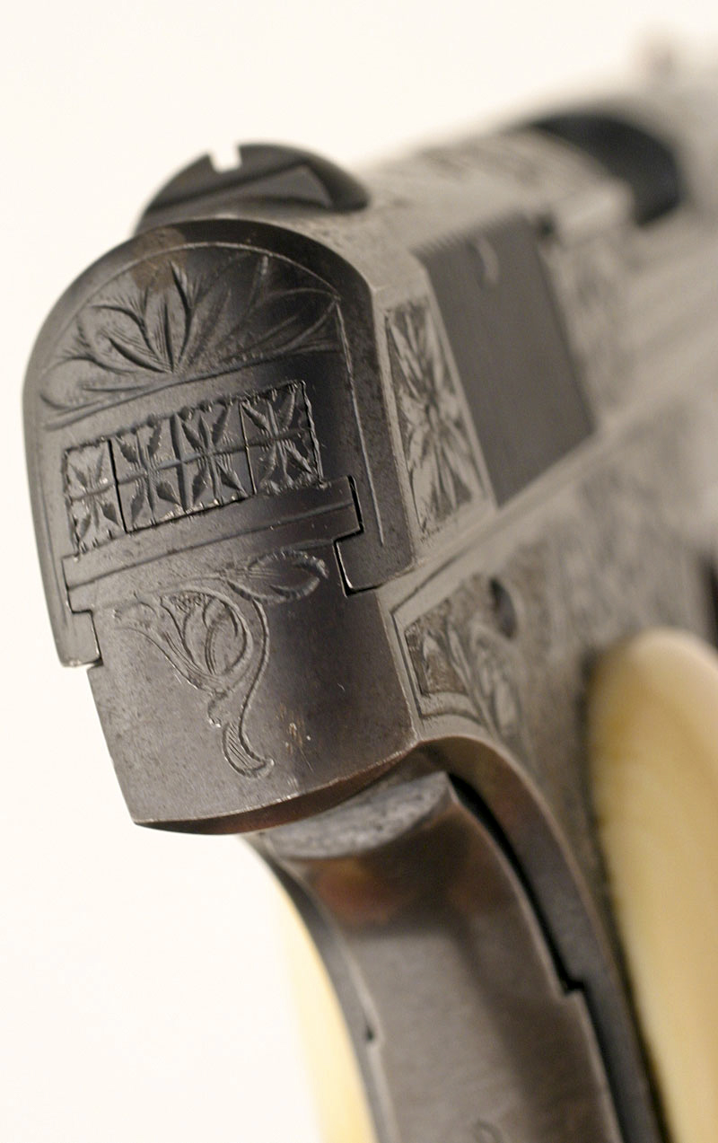 A very distinctive engraved treatment on the top radius of the slide wrapping over the upper edge and onto the left side.