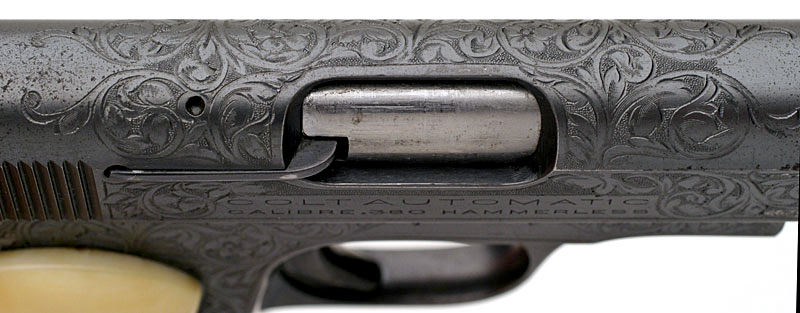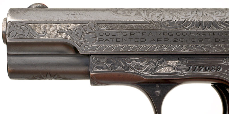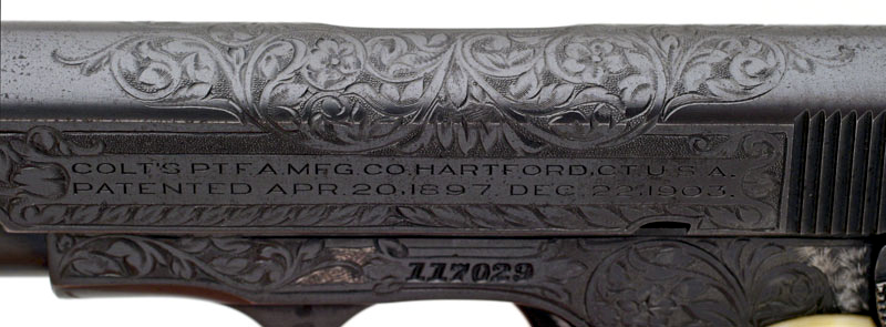 Colt 1908 Pocket Hammerless .380 ACP serial number 117029 - close-up of left side of slide showing engraving cut through the blue on the slide and to the left of the serial number. Notice how the engraved leaves that enter the white engraved areas have a blued finish.