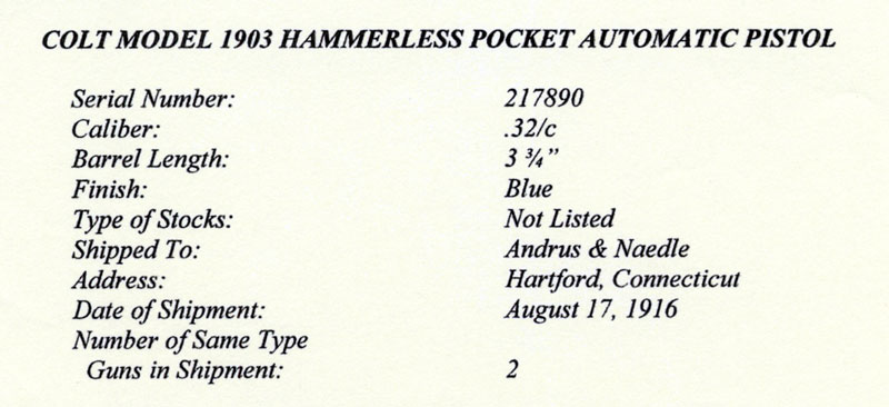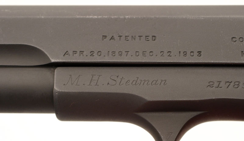 Colt Model 1903 Pocket Hammerless .32 ACP serial number 217890 (ca. 1916) inscribed to "M.H. Stedman" on left side of the frame. Pistol was shipped to Andrus & Naedele (sic. Naedle), Hartford, Connecticut on August 17, 1916 in a two gun shipment. Inscription is believe to be factory from both the style and the fact that Morgan Stedman was a Colt employee. (See February 2007 Gun of the Month for another gun shipped to Morgan Stedman). Pistol is parkerized and was presumably refinished at the factory in the 1940s. Barrel is stamped with the gun's serial number 217890 in front of the lugs. Thumb safety is blued as is the extractor. Feed ramp on frame is polished bright.
