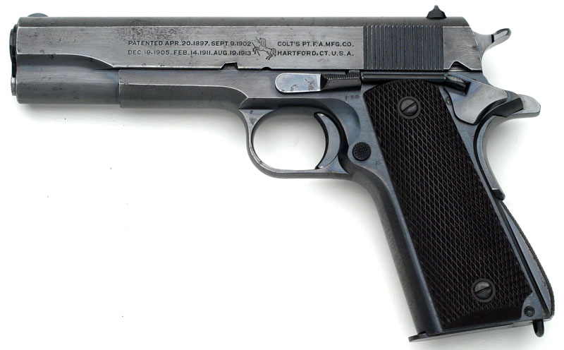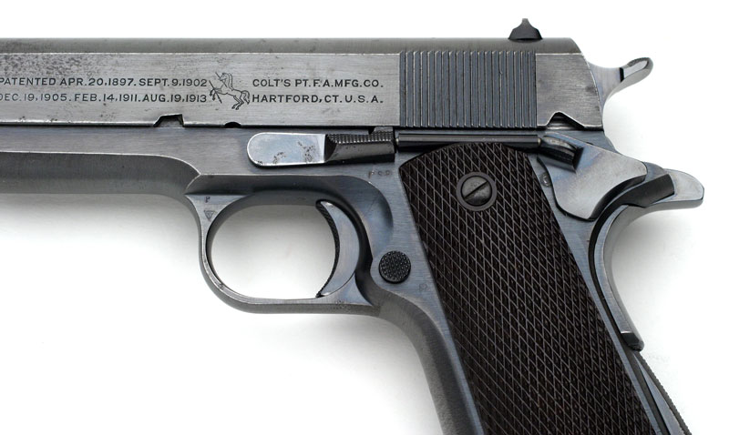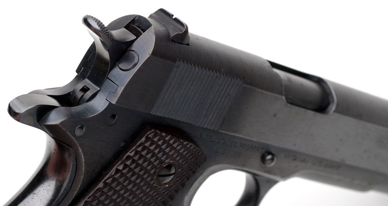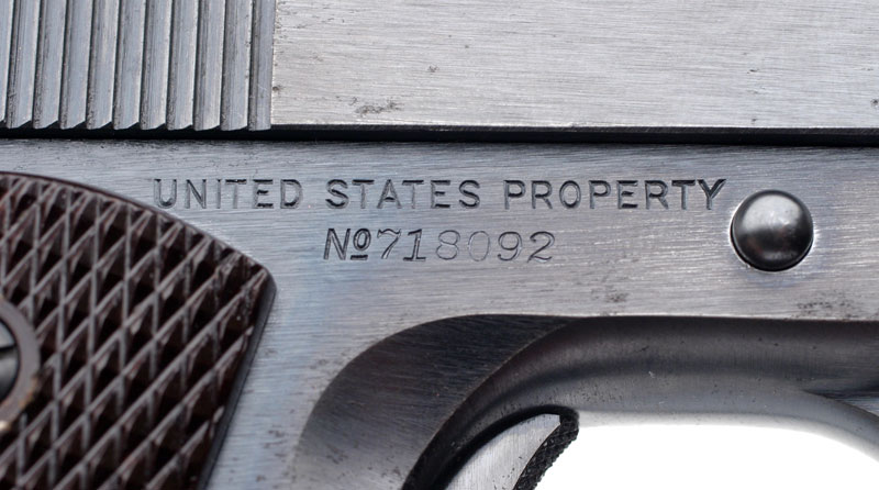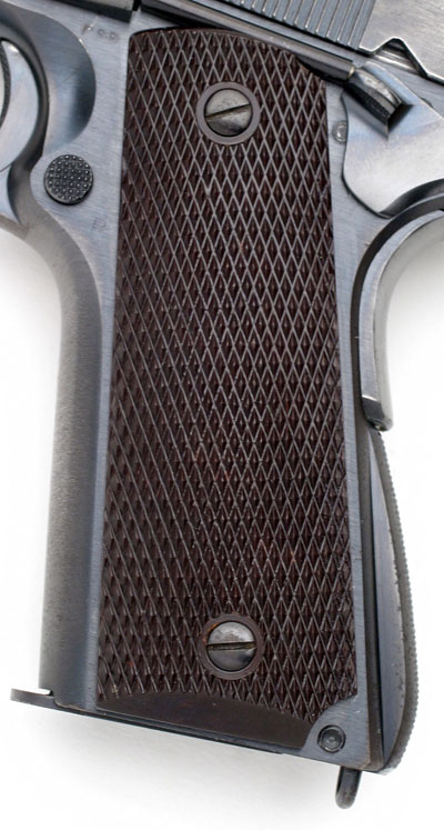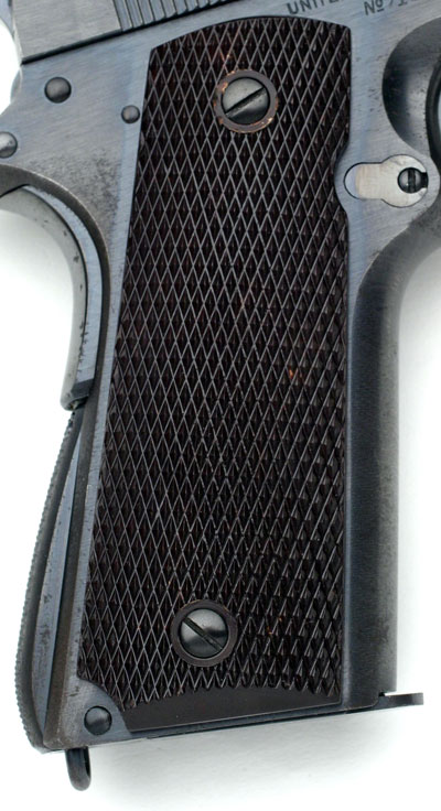 Colt Model 1911A1 - Blued Colt M1911A1 .45 cal. S/N 718092, the slide is numbered to match, CSR inspectors mark on left side of the frame and on the top of the frame near the disconnector. Pistol has Coltrock stocks which are not commonly encountered on these pistols as it proved to be too brittle for military use. Pistol was one of 1,300 pistols shipped to the Commanding Officer, Springfield Armory on April 18, 1940. This was the first shipment of the 4,696 pistols delivered in 1940.