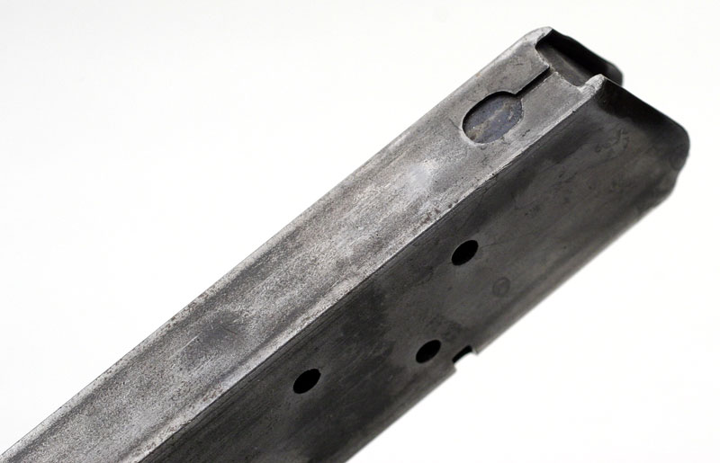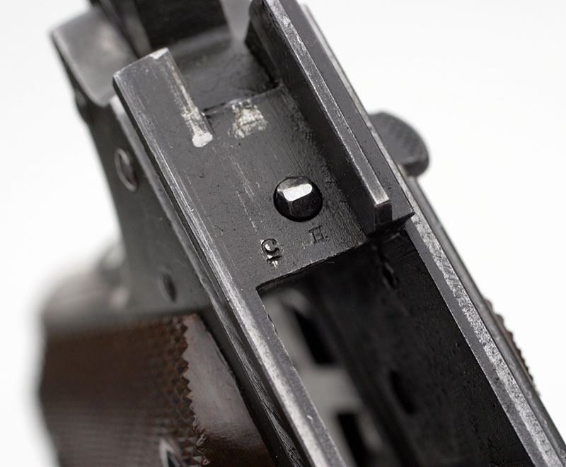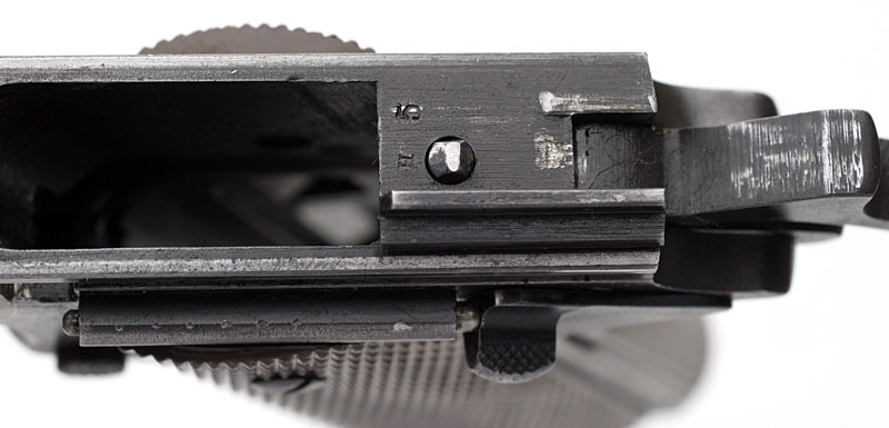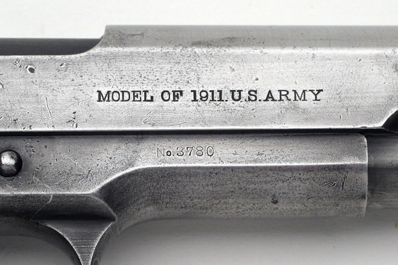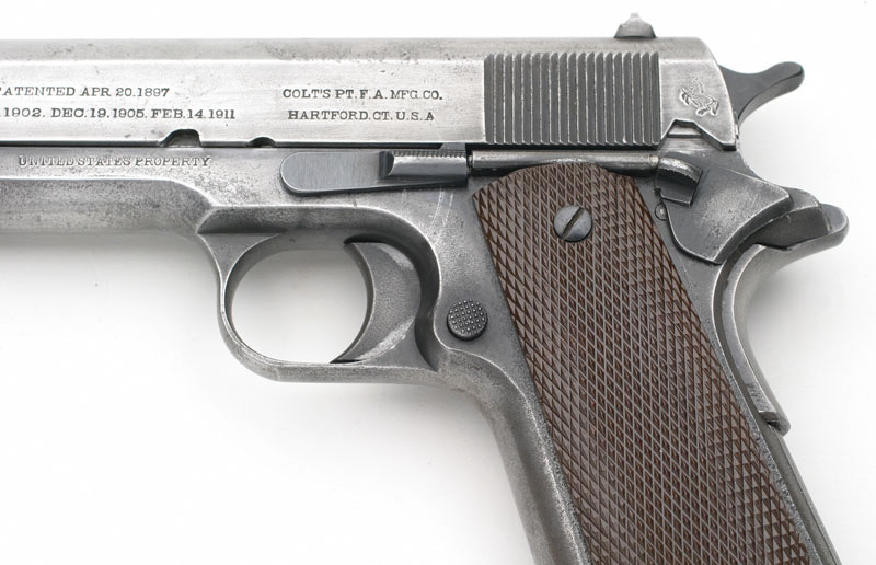 Left side. This example bears the ordnance mark W.G.P., for Major Walter G. Penfield, in the form of a monogram stamped on the left side of the frame above the magazine release. Penfield inspected these pistols from January 2, 1911 - September 30, 1914. Serial numbers of Model 1911 pistols inspected 1 - 101500.