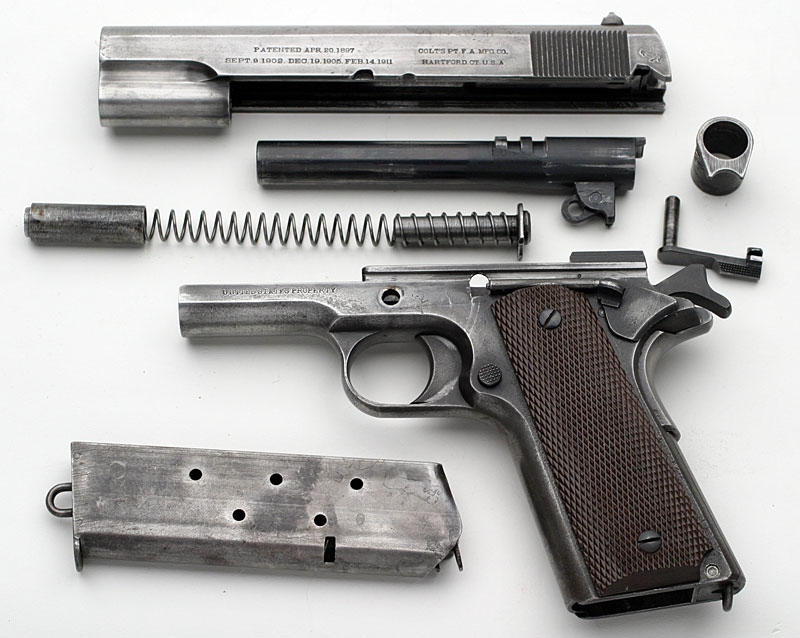 This example has some replaced parts (slide is from a slightly later Model 1911, magazine release pin is a later type and hammer and grips [also mismatched] are from a M1911A1). Barrel is original and is marked on the rear of the hood with a horizontal serif "H" and gun has key-hole magazine. Gun has very little finish remaining and is being presented as-found.