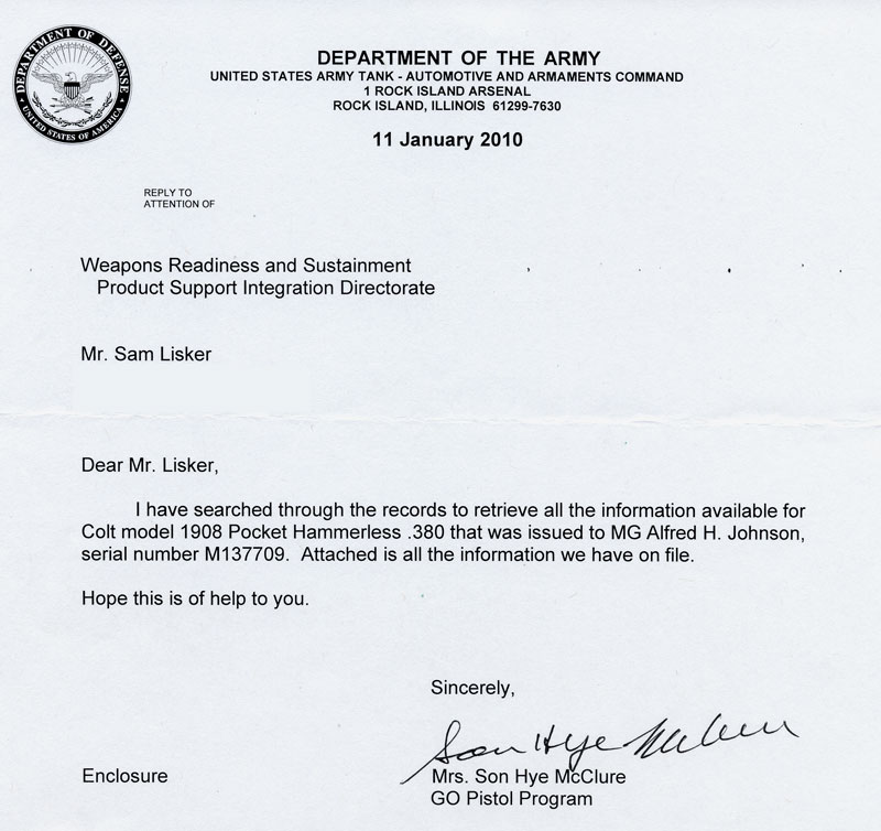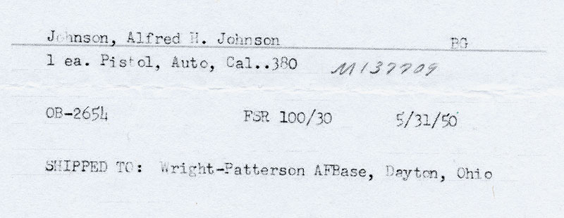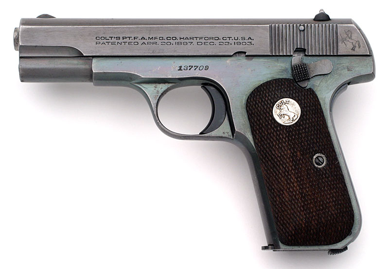 Colt 1908 .380 caliber sidearm, serial number M137709. Shipped to