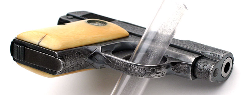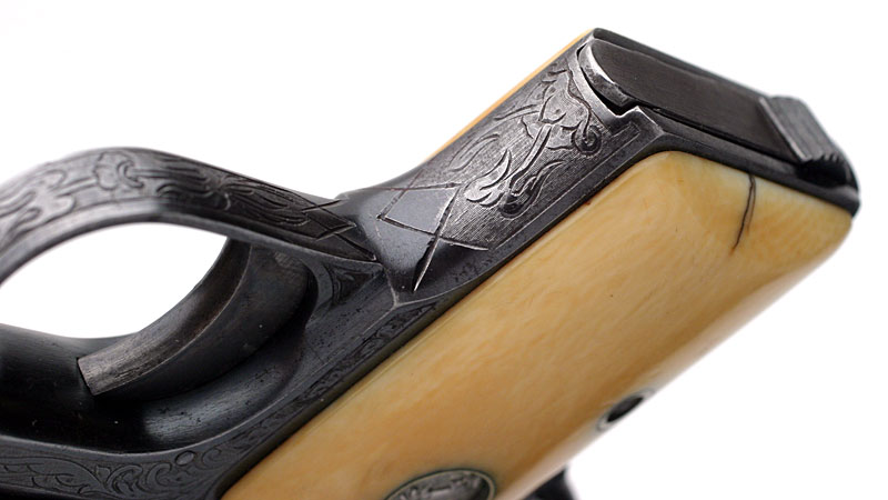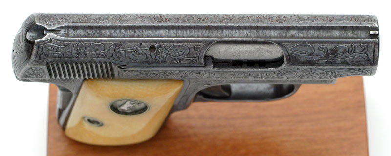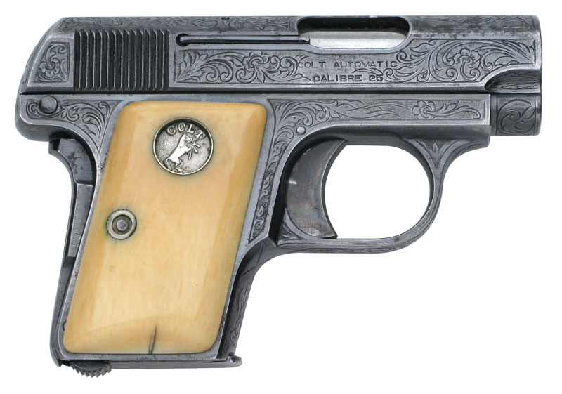 Colt 1908 Vest Pocket .25 ACP Serial Number 163166 Factory Master Engraved by William H. Gough Blue Finish, Gold Inlaid Monogrammed Ivory Stocks - The records indicate this pistol was shipped out as a .25/c, 2", in the Green state for engraving. It was shipped to A.H. Fox Gun Co. in Philadelphia, PA for William H. Gough on April 20, 1917, a shipment of 1 gun. For other factory engraved Colt 1908 Vest Pocket .25 ACP pistols by William H. Gough, See: Gun of the Month - December 1998 Gun of the Month - January 2003 Gun of the Month - September 2009 Gun of the Month - January 2010