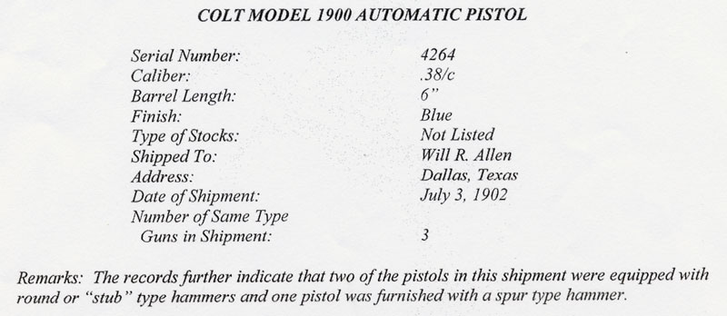 Model 1900 Sight Safety Altered Serial Number 4264 - This pistol is one of the last Model 1900 Colt .38 automatic pistols manufactured. It has front plunge milled serrations, high polish blue, high spur hammer and factory altered sight safety. The high serial number for the Model 1900 is 4274 and the highest number observed is 4268. Serial number 4264 (above) is the highest serial number observed with the sight safety altered slide, although 4272 and 4274 are both recorded as having been shipped with "old style rear sight & safety." Colt Model 1900 serial number 4264 was shipped to retailer Will R. Allen, Dallas, Texas on July 3, 1902 in a shipment of three pistols. The other two pistols in this shipment were 4275 (the very first Model 1902 Sporting) and 4277. Both of the Sporting Models were shipped with stub hammers.
