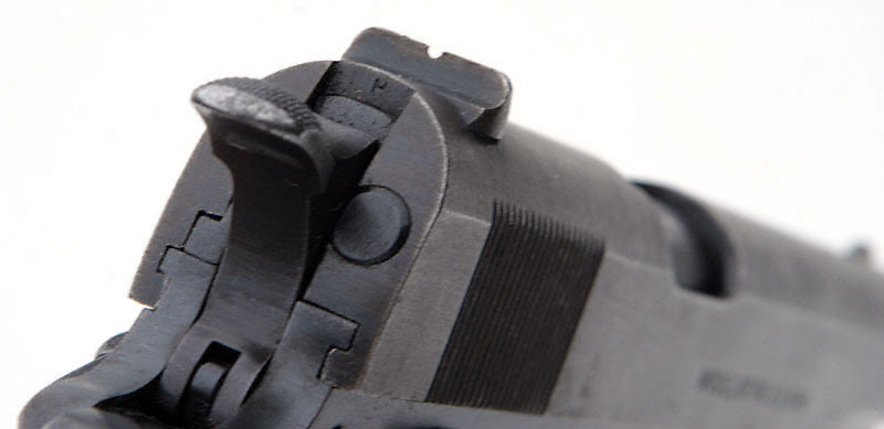 "H" mark on rear of slide, above hammer. |