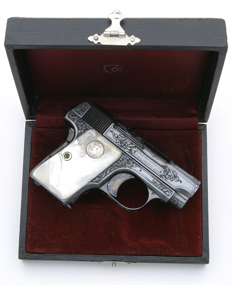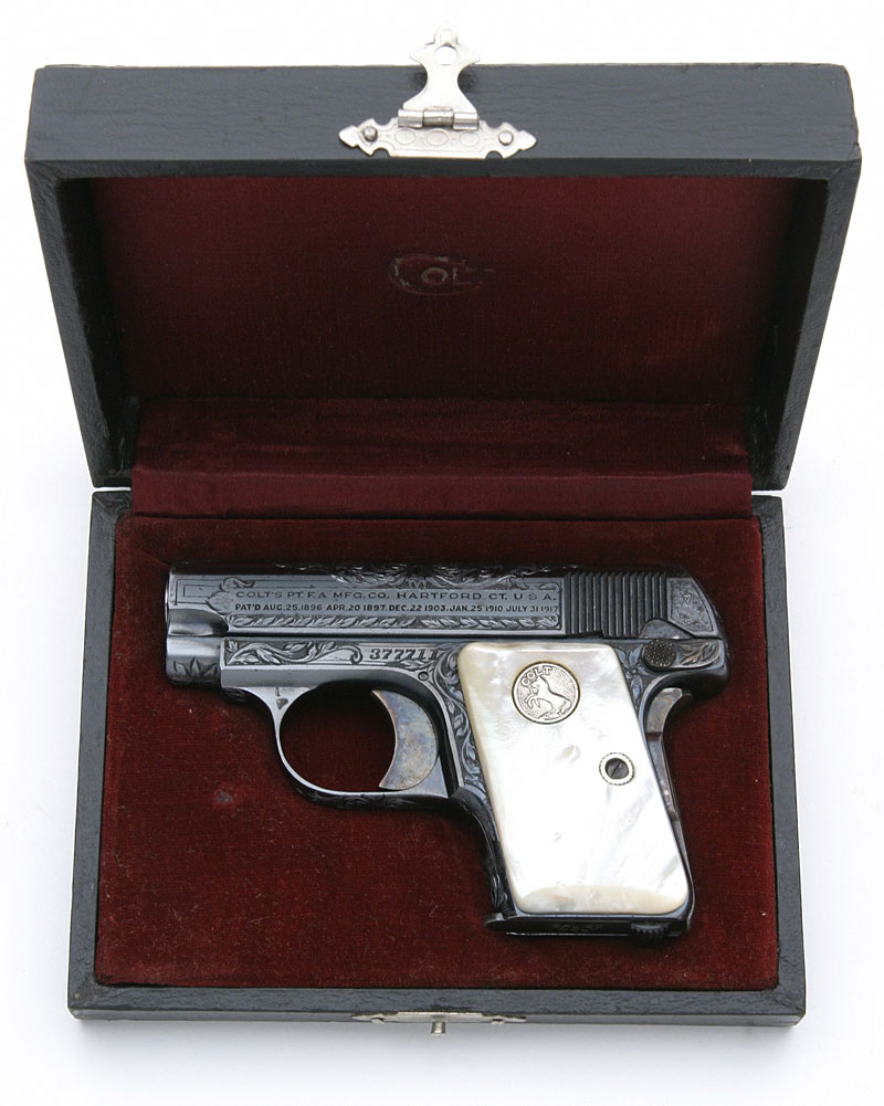 Factory Engraved Colt 1908 Vest Pocket .25 ACP serial number 377711 - pictured in maroon lined factory presentation case (left side).
