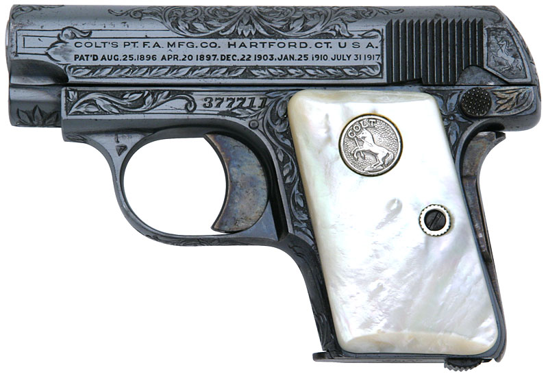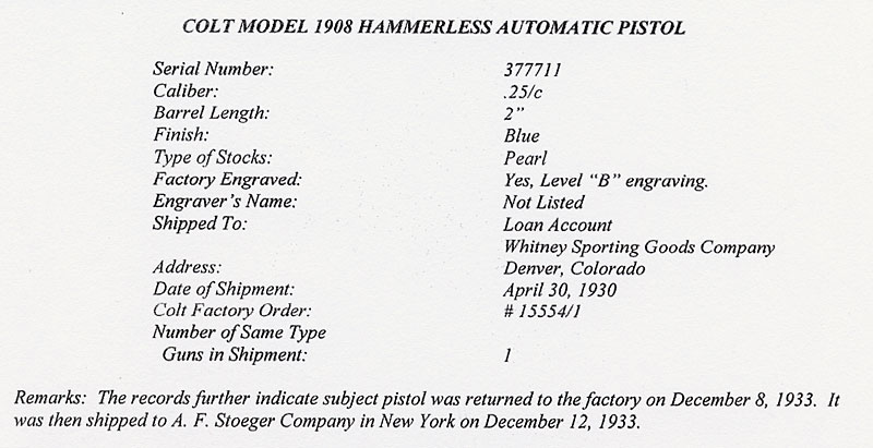 ![]() Factory Engraved Colt 1908 Vest Pocket .25 ACP serial number 377711 - Factory "B" engraved, blue finish with flush medallion mother of pearl grips. Pistol was a single gun shipment shipped to "Loan Account", Whitney Sporting Goods Company, Denver, Colorado on April 30, 1930. It was processed on Colt Factory Order number 15554/1. Factory records further indicate that the pistol was returned to the factory on December 8, 1933. It was then shipped to A.F. Stoeger Company in New York on December 12, 1933. While not specified in the letter, based on the pattern of engraving, this pistol was most likely engraved by Colt factory engraver Wilbur Glahn. Glahn engraved others that are close in number to 377711.