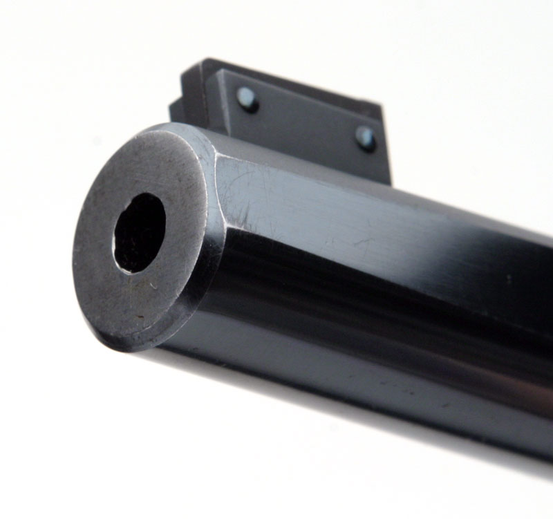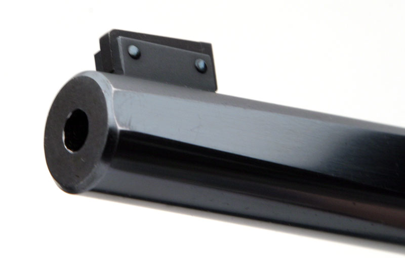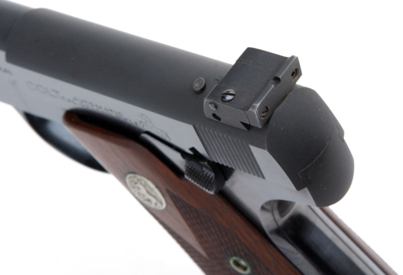 Colt Woodsman Match Target barrel muzzle and front sight.  Note how the sight screws are fire blued.