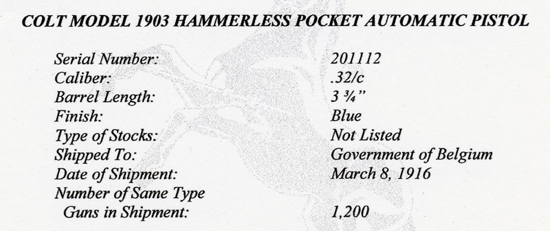 Colt 1903 .32 ACP serial number 201112 - Belgian military contract pistol, shipped with blue finish, stocks not listed, on March 8, 1916 to the Government of Belgium in a shipment of one of 1,200 pistols.  Pistol has the "A" in a Diamond on the left side of the frame to the right of the serial number.  This pistol was subsequently painted black and has British proof marks.  Pistol also features early Type III black hard rubber stocks with small rampant Colt.  This style of grips was used following the discontinuation of the Stylized "C" Type II hard rubber grip.
