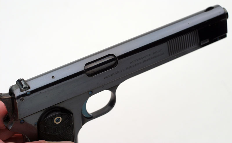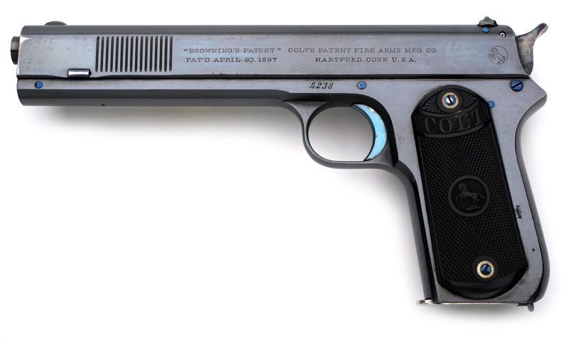 Colt Model 1900 serial number 4238 showing slide markings and color case hardened hammer with fire blue pins and screws.